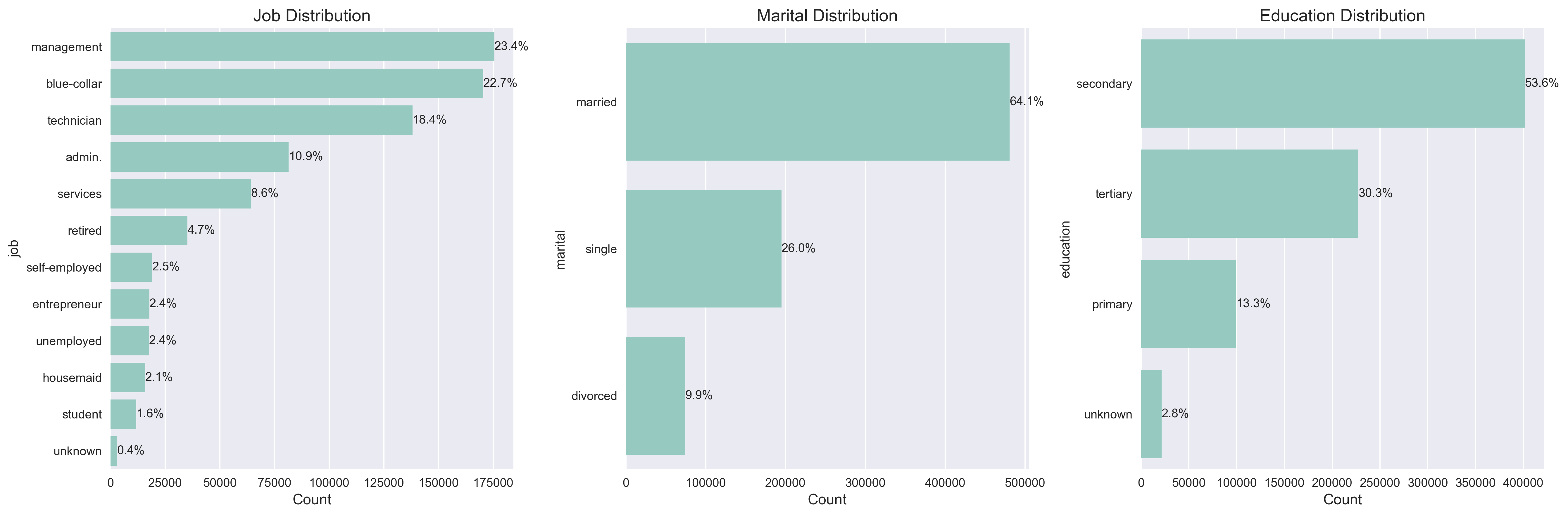 Management roles represent the largest customer segment (23.5%), followed by blue-collar workers and technicians. Most customers are married (61.0%) with secondary education (51.3%).
