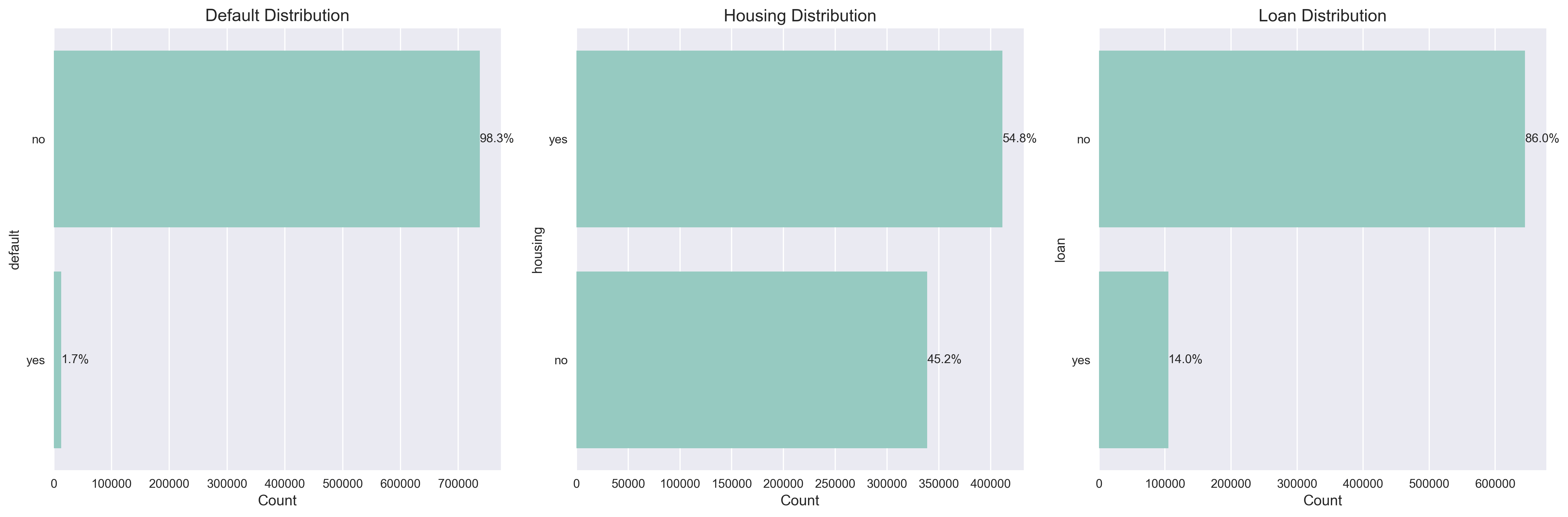 Credit defaults are extremely rare (only 0.7%), while housing loans are common (56.2%) and personal loans less frequent (16.2%).