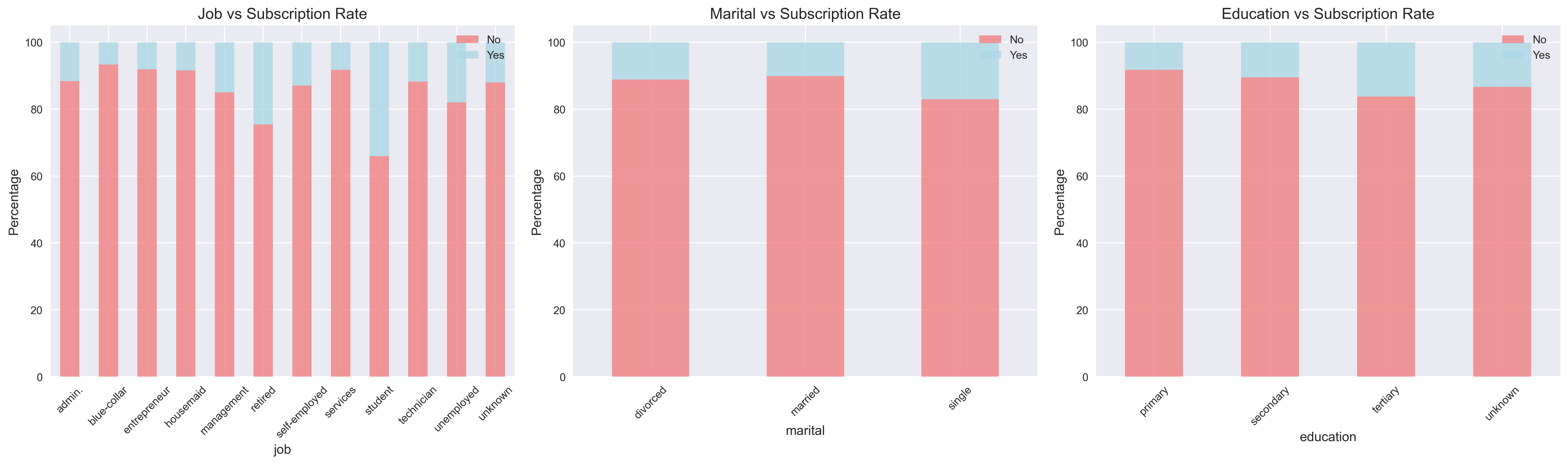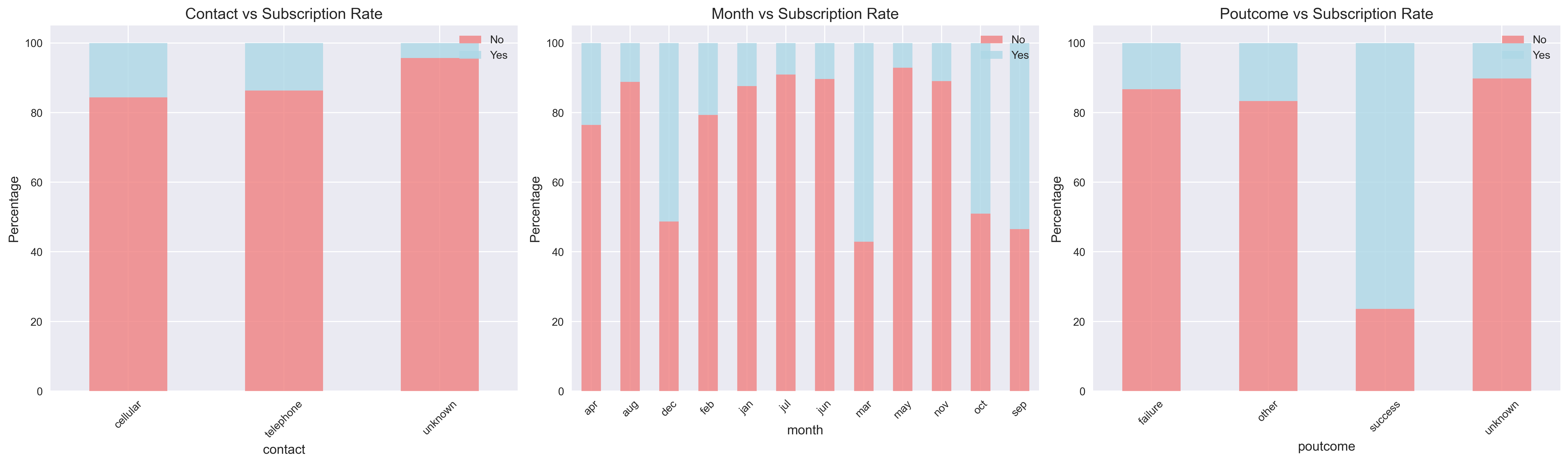 Previous positive interactions are strong predictors of future subscriptions. Customers who responded successfully in past campaigns have a 76.4% conversion rate, underscoring the importance of maintaining relationships in financial services.
