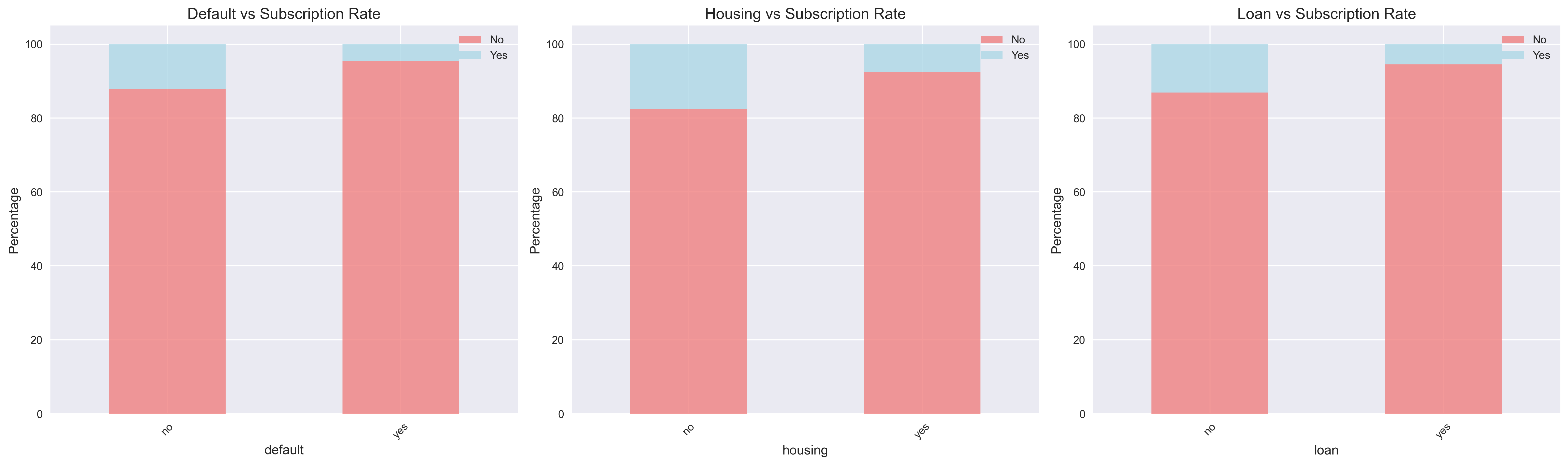 Financial product holdings show minimal impact on subscription rates, with slight variations across housing and loan status.
