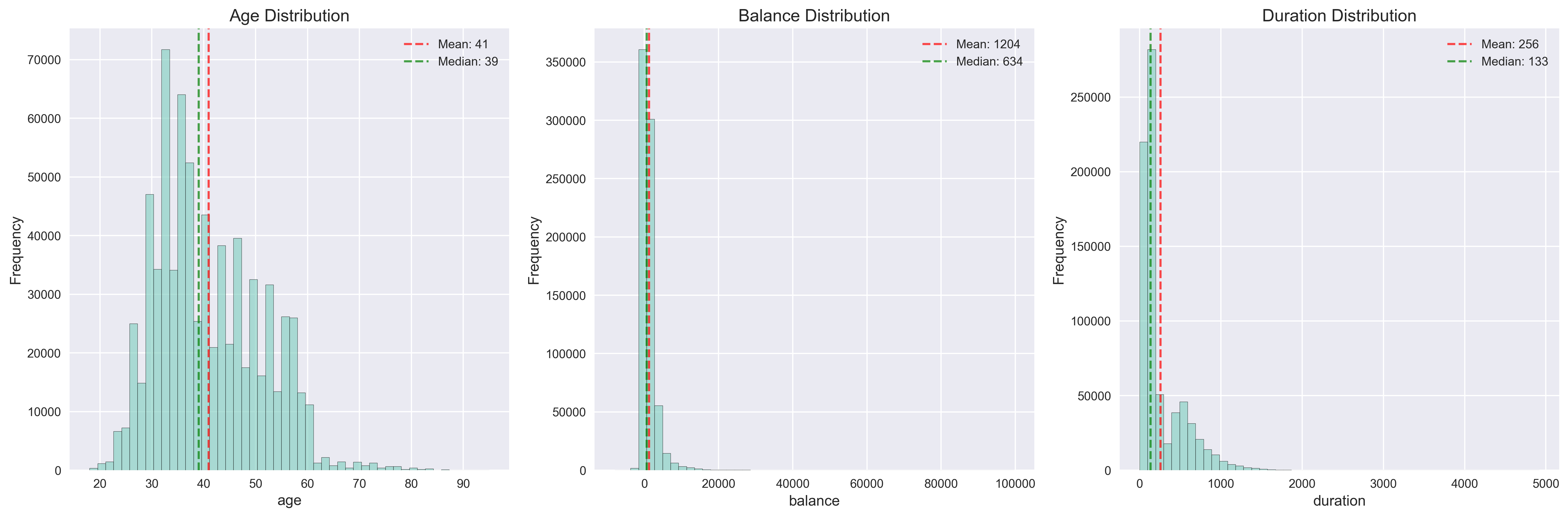 Customer demographics and engagement: Ages range from 18-95 with mean of 41 years. Account balances vary widely (-8,019 to 99,717) with median of 634, indicating modest balances for most customers. Call duration shows right-skewed distribution with mean of 256 seconds.