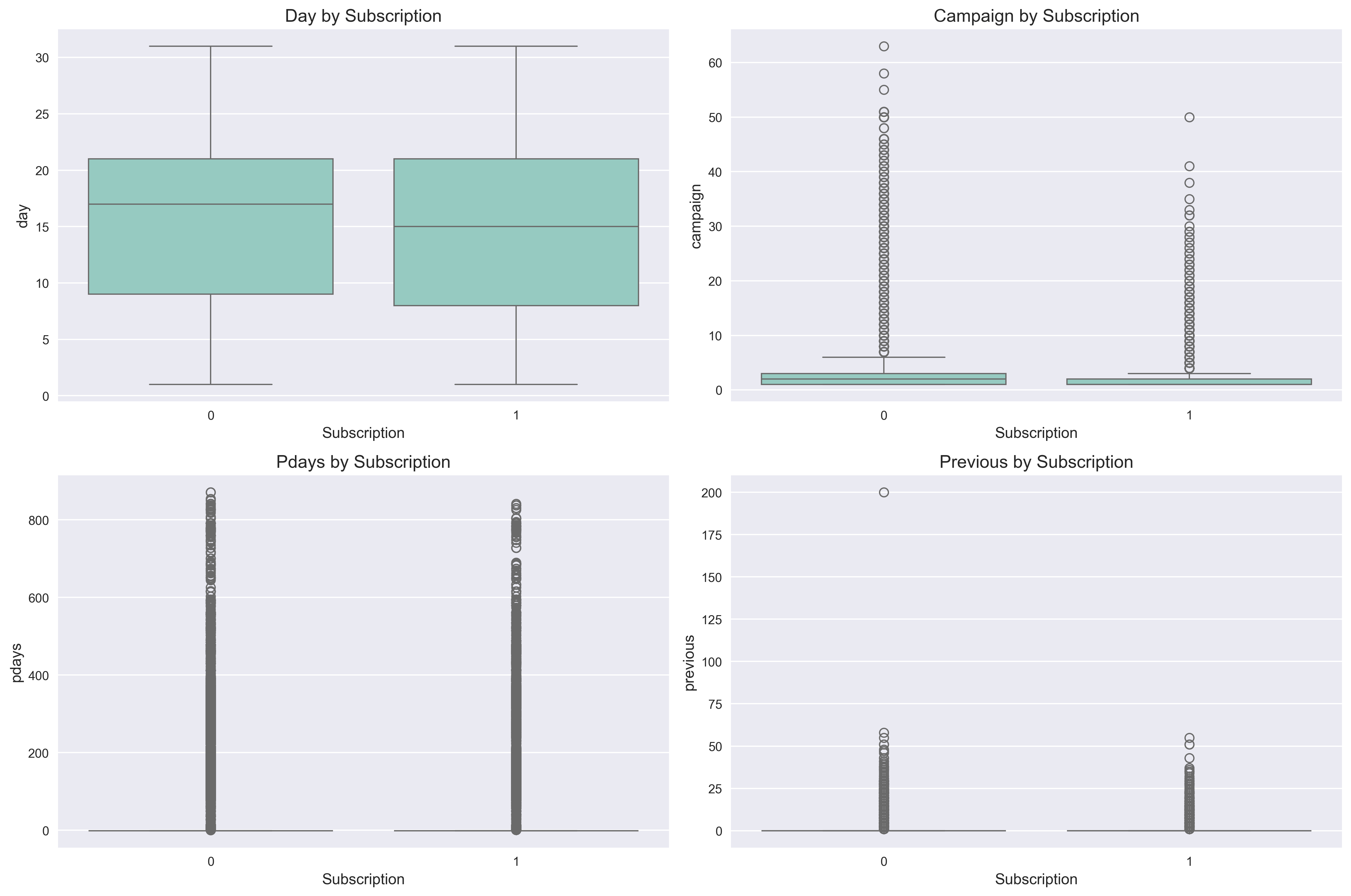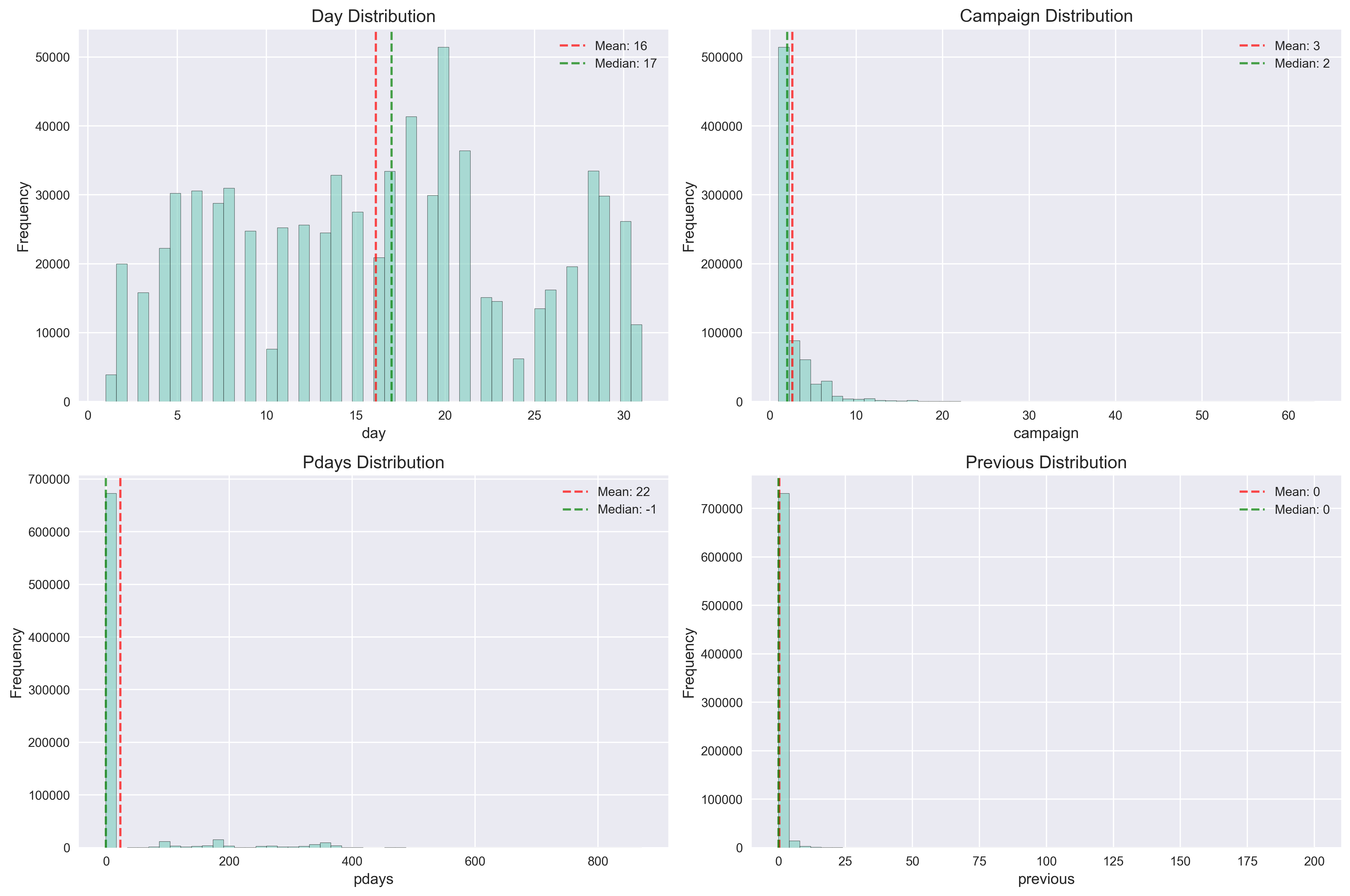 Campaign characteristics: Contact day shows uniform distribution (1-31). Most customers receive 2-3 campaign contacts. The pdays feature has many -1 values (indicating no previous contact), while previous contacts are typically zero or low values.