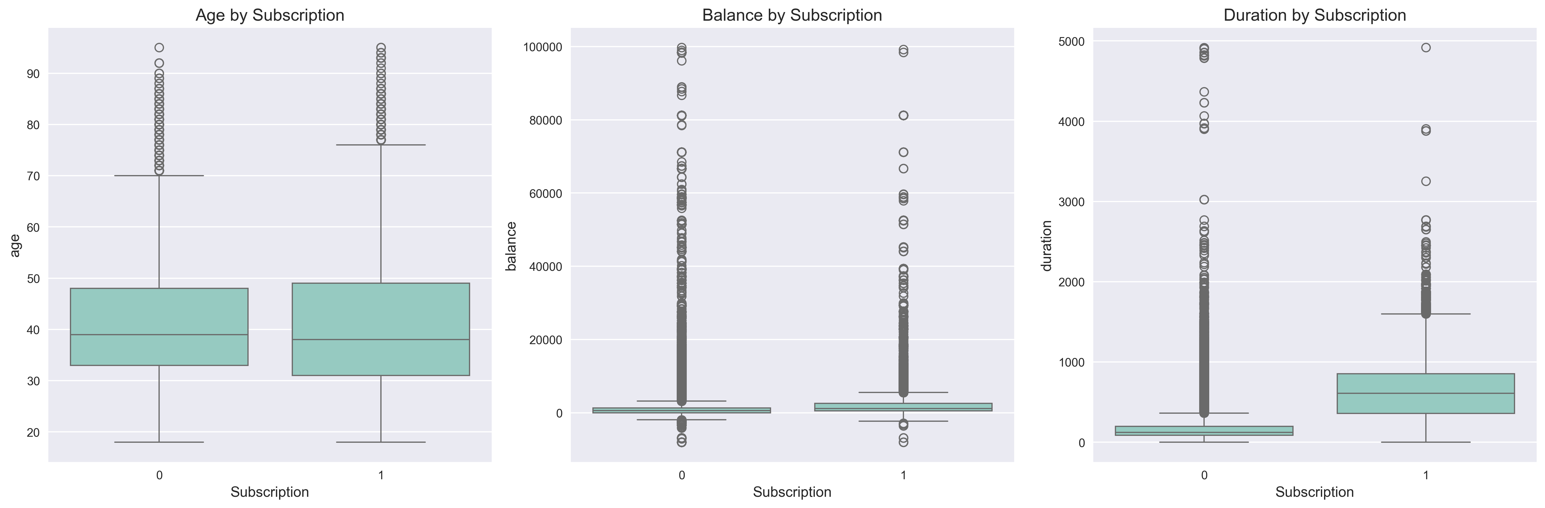 Call duration emerges as the strongest predictor. Subscribers average 525 seconds per call compared to 212 seconds for non-subscribers. This engagement metric serves as an early success indicator during campaigns. Age and balance show minimal differences between subscription groups.