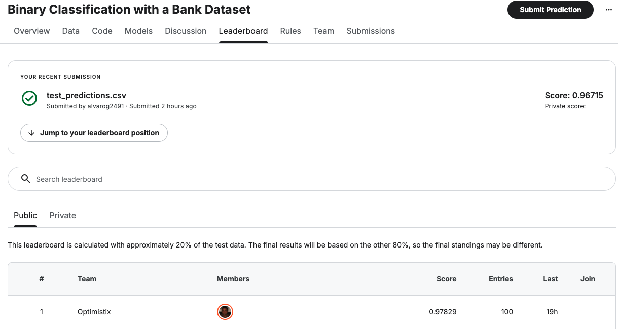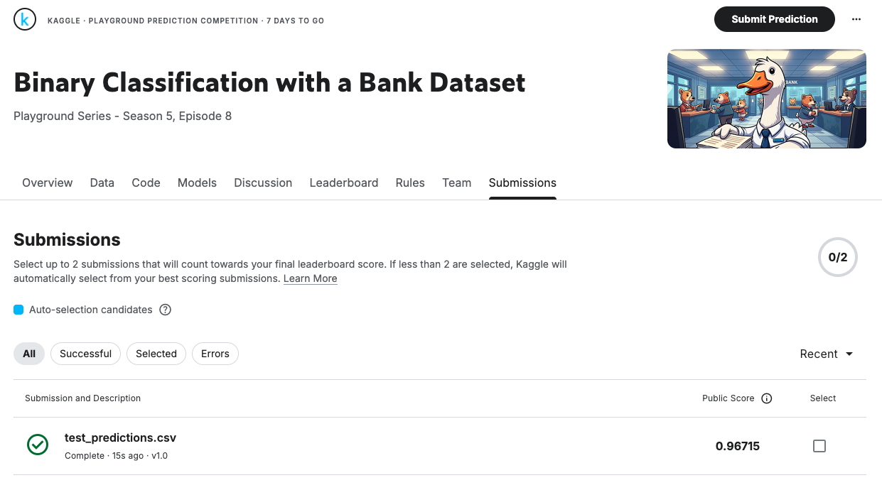 The first submission results are quite encouraging. Scoring 0.96715 puts me in a strong position - this is genuinely close to perfect prediction with an AUC near 1.0. The gap to leader is only 1%, which shows our model selection and MLflow pipeline are working well.